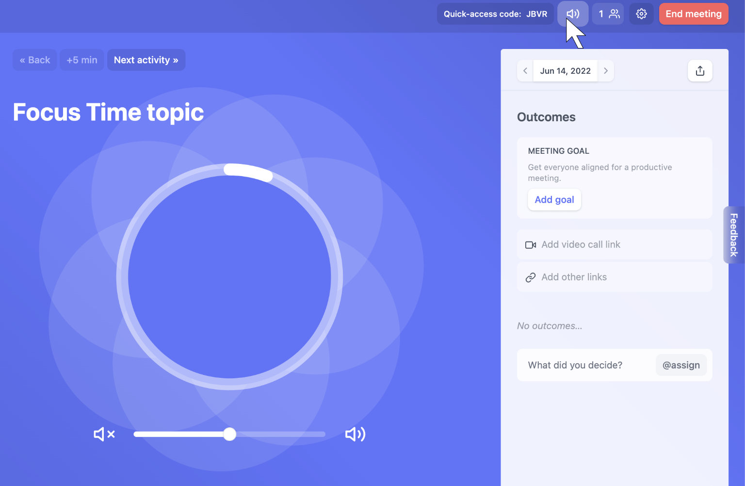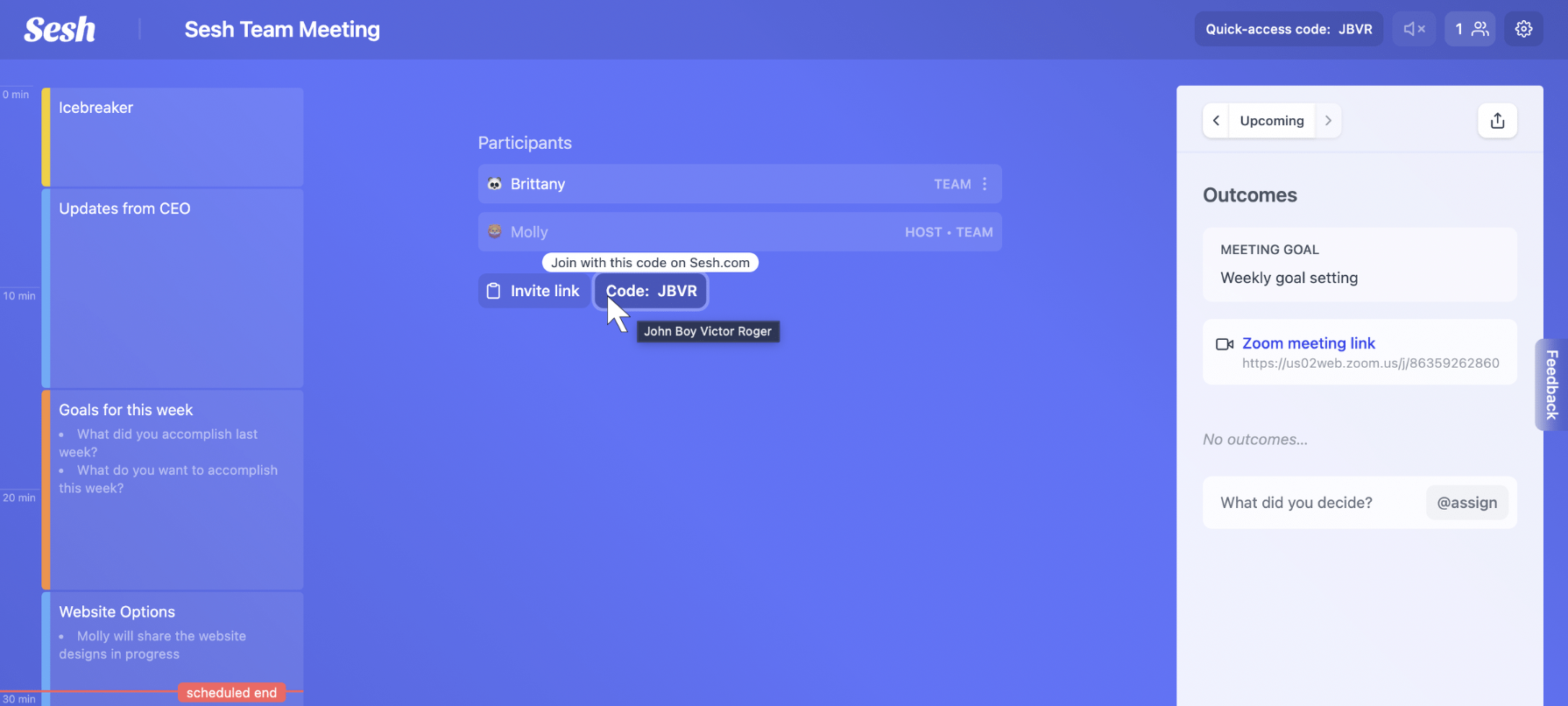 Finally, Sesh will provide you with a timeline of how your meeting should progress. Any time saved will be banked back to your group and allow you to wrap up early!